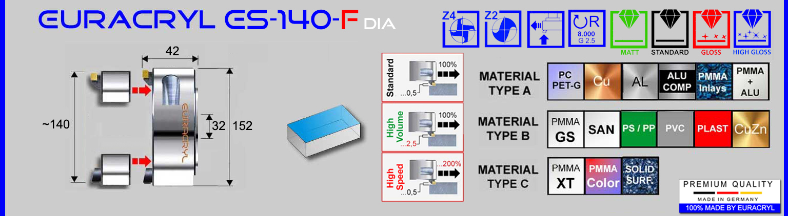 Plankopf mit fest eingebauten mono- oder polykristallinen Diamantschneiden für Hochglanz, Standard-Glanz, satinierte Flächen, Klebeflächen, etc. Für die Bearbeitung von Acrylglas (PMMA), Polycarbonat und andere glänzende oder transparente Kunststoffe sowie Mischmaterialien und Nichteisenmetalle. Anwendung in Messerkopfaufnahmen. Rechtsdrehend.