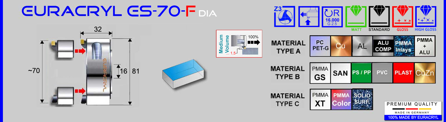 Plankopf mit fest eingebauten mono- oder polykristallinen Diamantschneiden für Hochglanz, Standard-Glanz, satinierte Flächen, Klebeflächen, etc. Für die Bearbeitung von Acrylglas (PMMA), Polycarbonat und andere glänzende oder transparente Kunststoffe sowie Mischmaterialien und Nichteisenmetalle. Anwendung in Messerkopfaufnahmen. Rechtsdrehend.