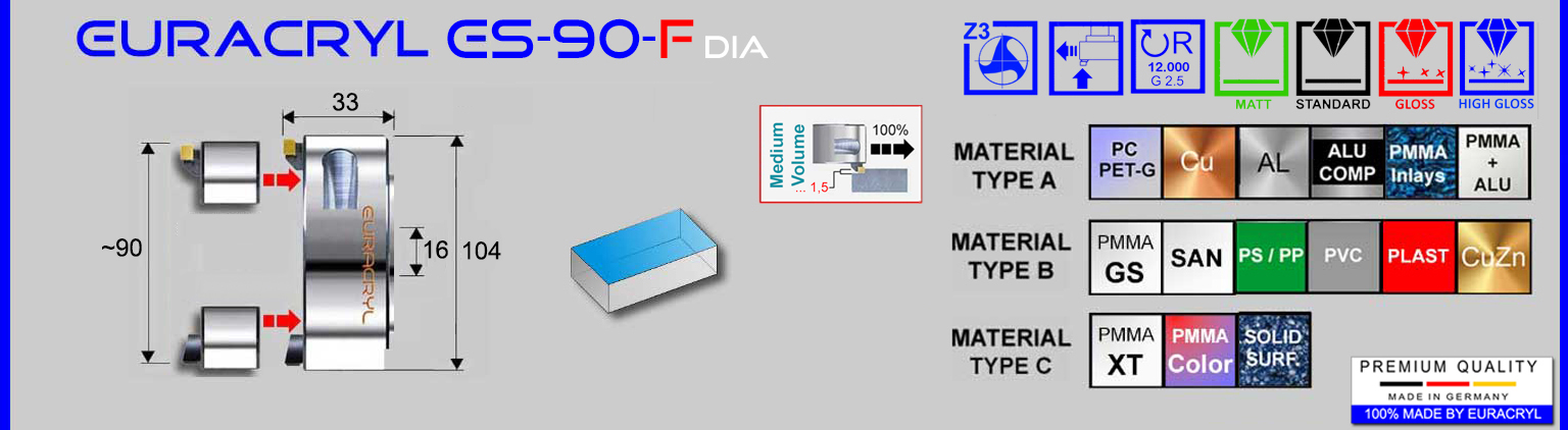 Plankopf mit fest eingebauten mono- oder polykristallinen Diamantschneiden für Hochglanz, Standard-Glanz, satinierte Flächen, Klebeflächen, etc. Für die Bearbeitung von Acrylglas (PMMA), Polycarbonat und andere glänzende oder transparente Kunststoffe sowie Mischmaterialien und Nichteisenmetalle. Anwendung in Messerkopfaufnahmen. Rechtsdrehend.