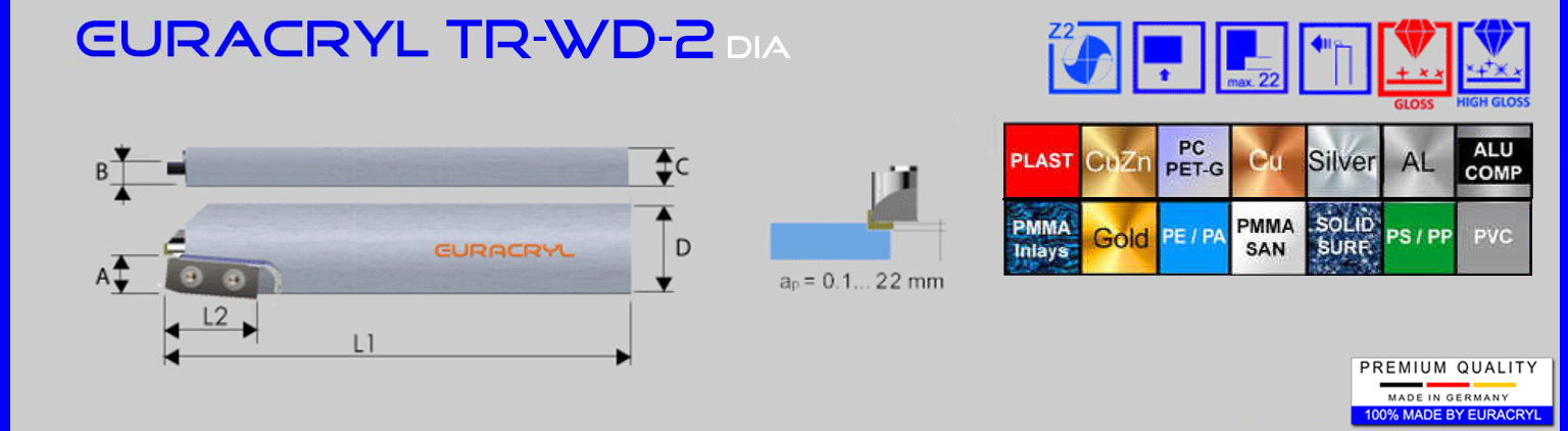 Zweistufige Außendrehmeißel mit mono- oder polykristallinen Diamant-Schlichtschneiden und großvolumigen WSP-Vorschneiden. Für HOCHGLANZ oder Glanz. Zur Bearbeitung von Acrylglas (PMMA) und anderen Kunststoffen. Für Längsdrehen mit extremen Drehtiefen.