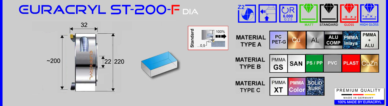 Plankopf mit fest eingebauten mono- oder polykristallinen Diamantschneiden für Hochglanz, Standard-Glanz, satinierte Flächen, Klebeflächen, etc. Für die Bearbeitung von Acrylglas (PMMA), Polycarbonat und andere glänzende oder transparente Kunststoffe sowie Mischmaterialien und Nichteisenmetalle. Anwendung in Messerkopfaufnahmen. Rechtsdrehend.