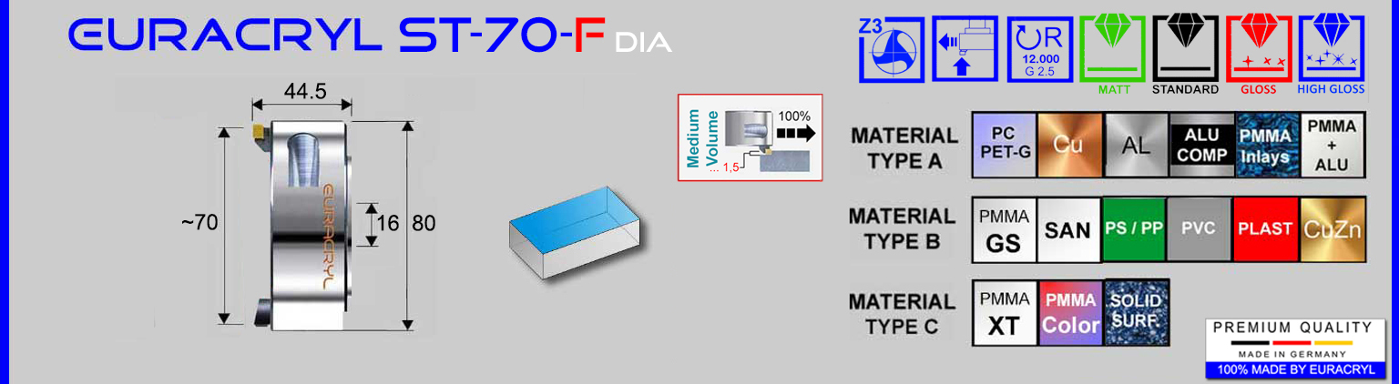 Plankopf mit fest eingebauten mono- oder polykristallinen Diamantschneiden für Hochglanz, Standard-Glanz, satinierte Flächen, Klebeflächen, etc. Für die Bearbeitung von Acrylglas (PMMA), Polycarbonat und andere glänzende oder transparente Kunststoffe sowie Mischmaterialien und Nichteisenmetalle. Anwendung in Messerkopfaufnahmen. Rechtsdrehend.